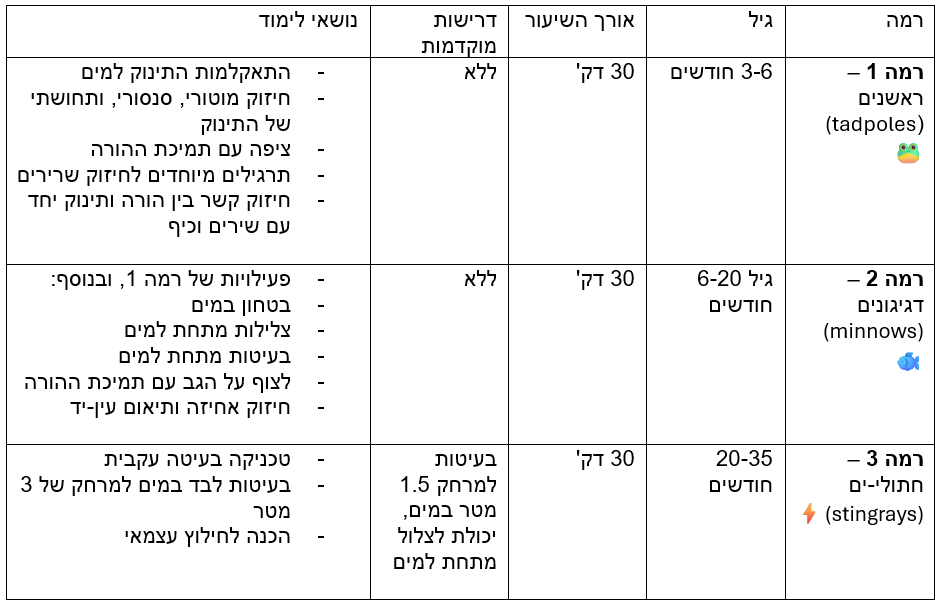 שחיית תינוקות – רמות 1-3, גיל 3-35 חודשים